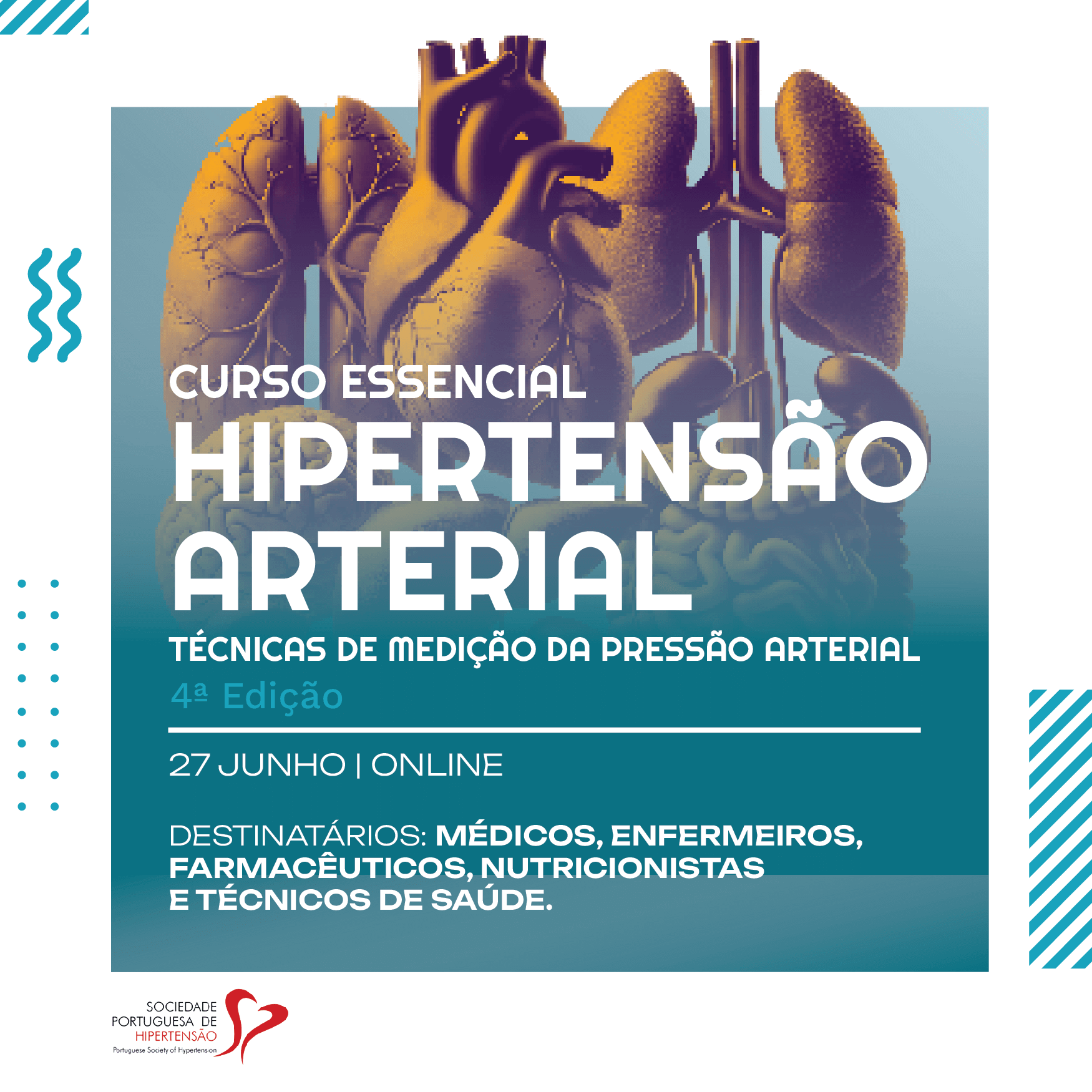 Este curso, dirigido a médicos, enfermeiros, farmacêuticos, nutricionistas e técnicos de saúde, tem como objetivo promover a atualização e o reforço de competências nas técnicas de medição da pressão arterial, uma componente fundamental para o diagnóstico e acompanhamento da hipertensão arterial na prática clínica.